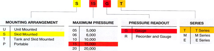 All High Pressure Test Units are equipped with a nameplate containing the unit model. This number contains the mounting arrangement, maximum pressure readout and series identification.
